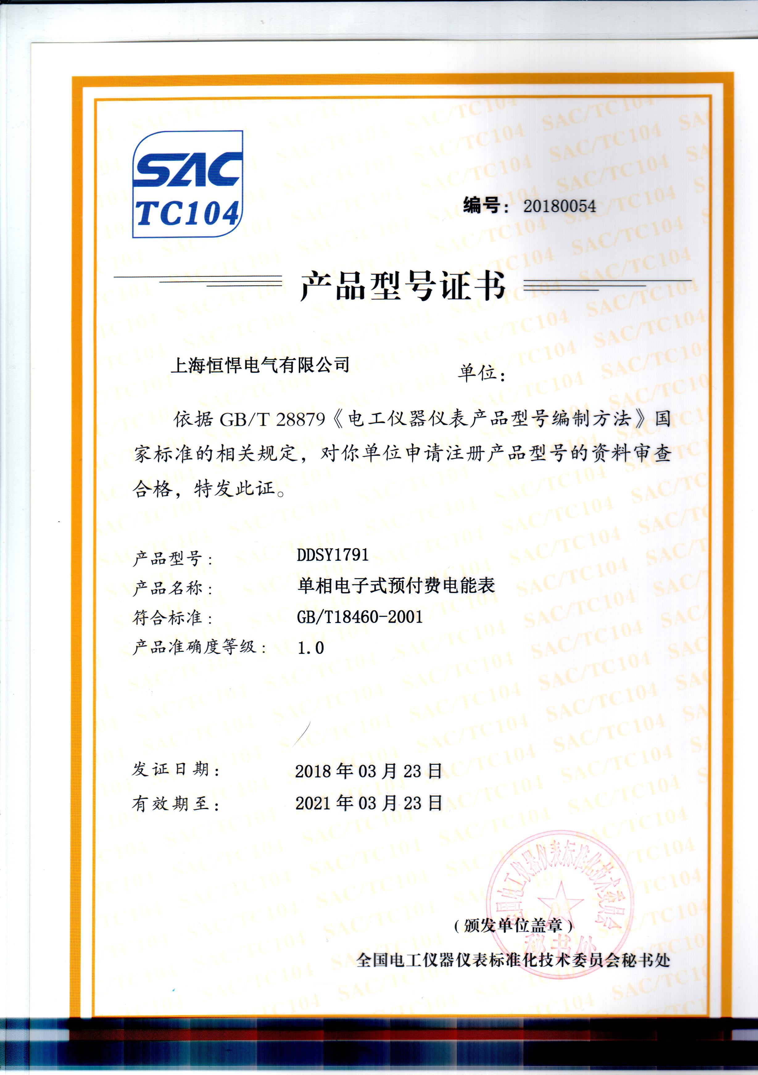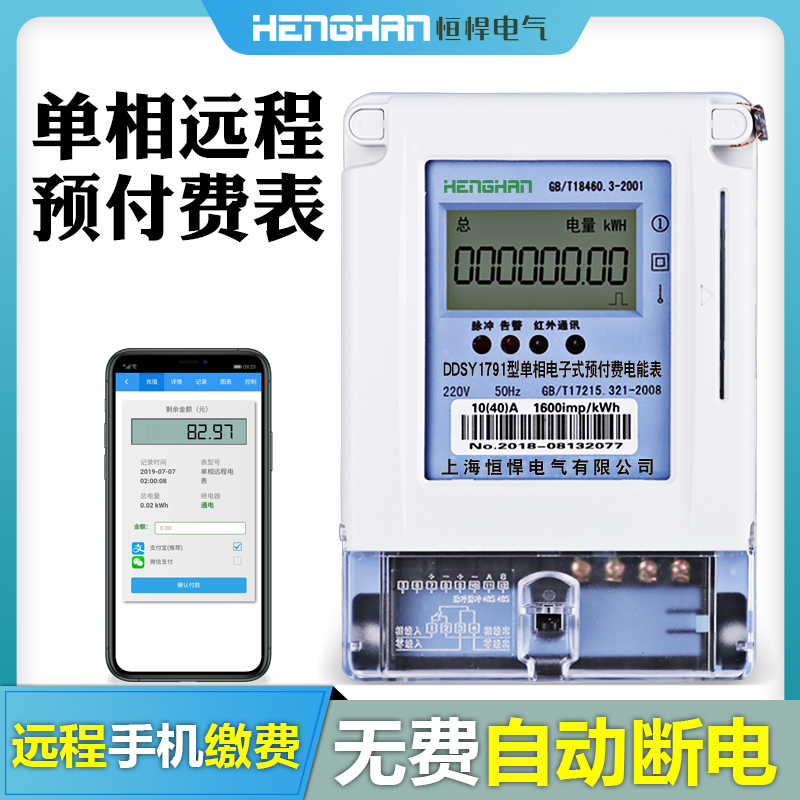 恒悍單相預付費電表型號證...